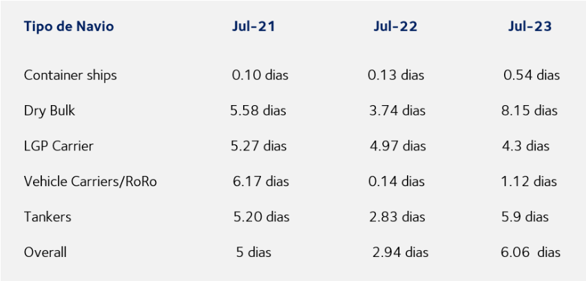 Referente à espera, vale observar que os dry bulks, navios-tanque e transportadores de gás natural liquefeito levam tempos de espera maiores. Os navios de contêineres não sofreram um grande impacto no tempo total de espera.