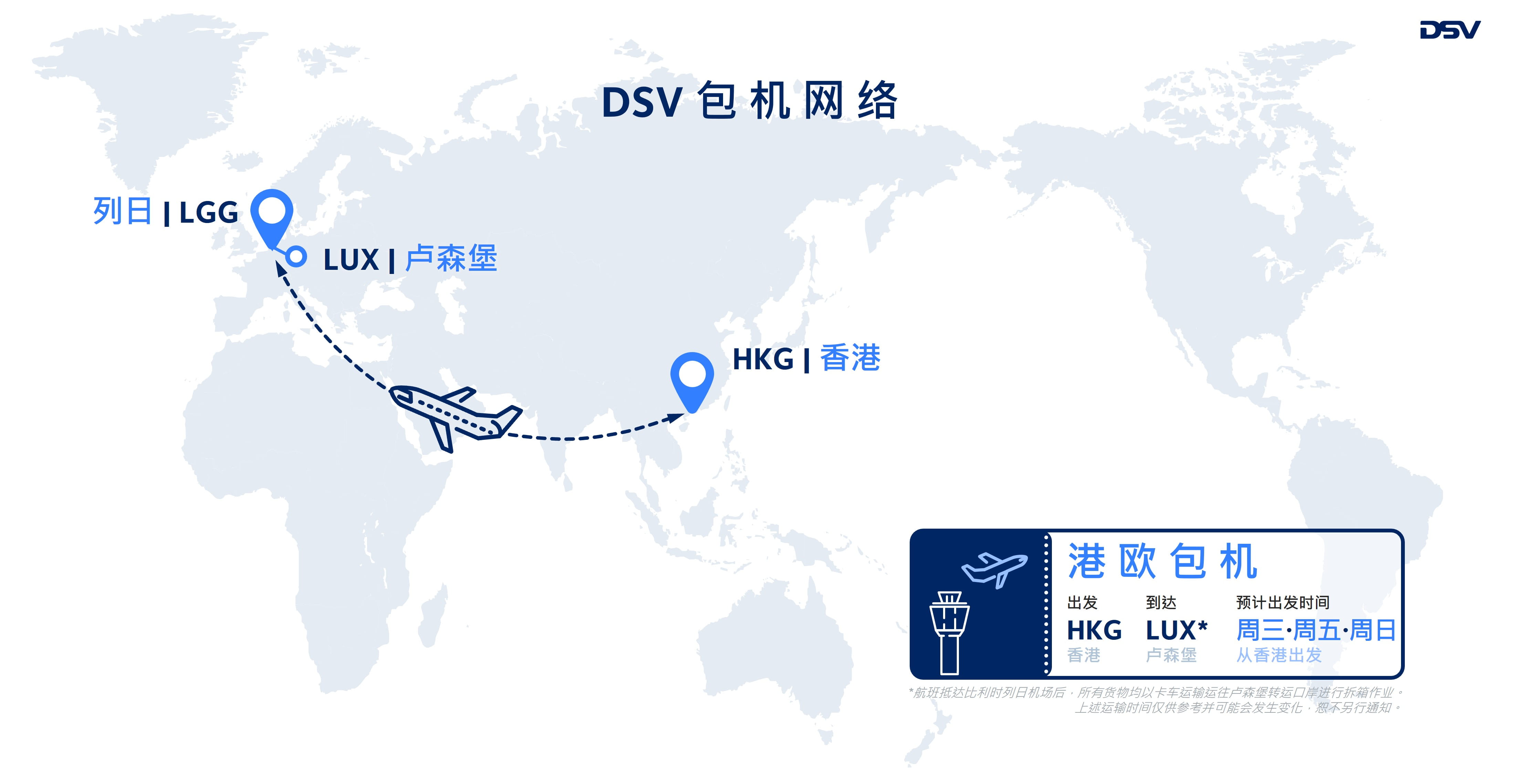 从2022年初,DSV包机网络在往返于亚太地区的两条特定航线上增加了更多运力。我们会为客户提供每周三趟从香港到列日的往返航班,以及新加坡和洛杉矶之间的全新直飞航线。